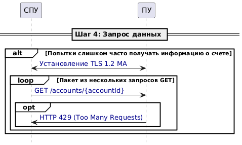 СПУ предоставляет (действительный) токен доступа, который используется для генерации пакета из нескольких запросов на получение подробной информации о счете. ПУ возвращает ответ 429 (Too Many Requests).