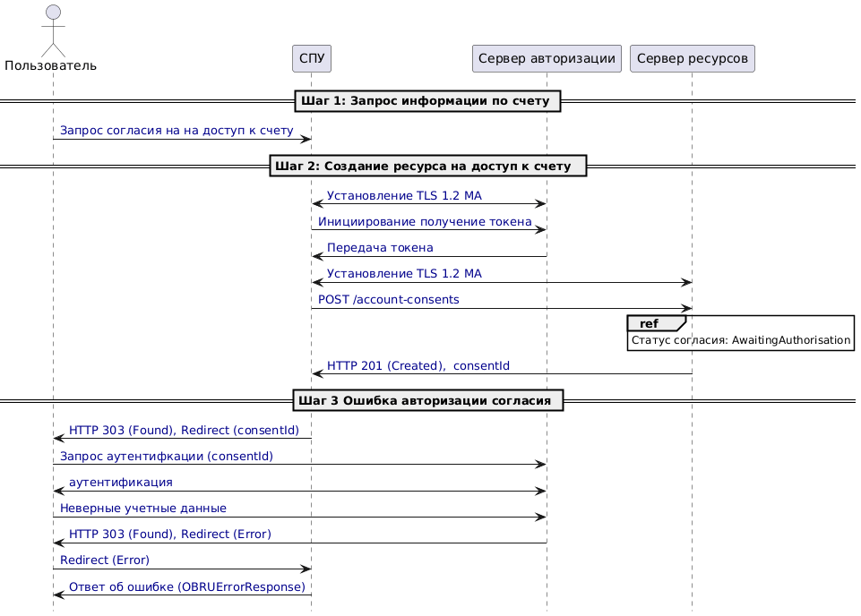 СПУ создает ресурс согласия на доступ к счету с помощью метода POST и получения доступа client credentials. Этот ресурс определяет разрешения (permissions) к кластерам данных, которые присылает СПУ от имени Пользователя. На начальном этапе согласие не авторизовано, поскольку ПУ еще его не актуализировал и не авторизовал во взаимодействии непосредственно с самим Пользователем.