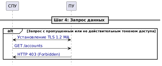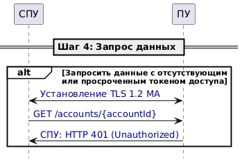 В случае предоставления от СПУ в адрес ПУ просроченного или отсутствующего токена доступа в попытке запросить данные, ПУ отвечает ошибкой HTTP 401 (Unauthorized).