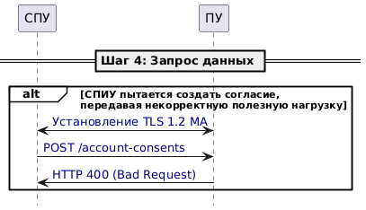СПУ предоставляет неверно сформированный запрос или запрос с некорректной полезной нагрузкой к ПУ для согласия на доступ к счету. ПУ отвечает ошибкой HTTP 400 (Bad Request).